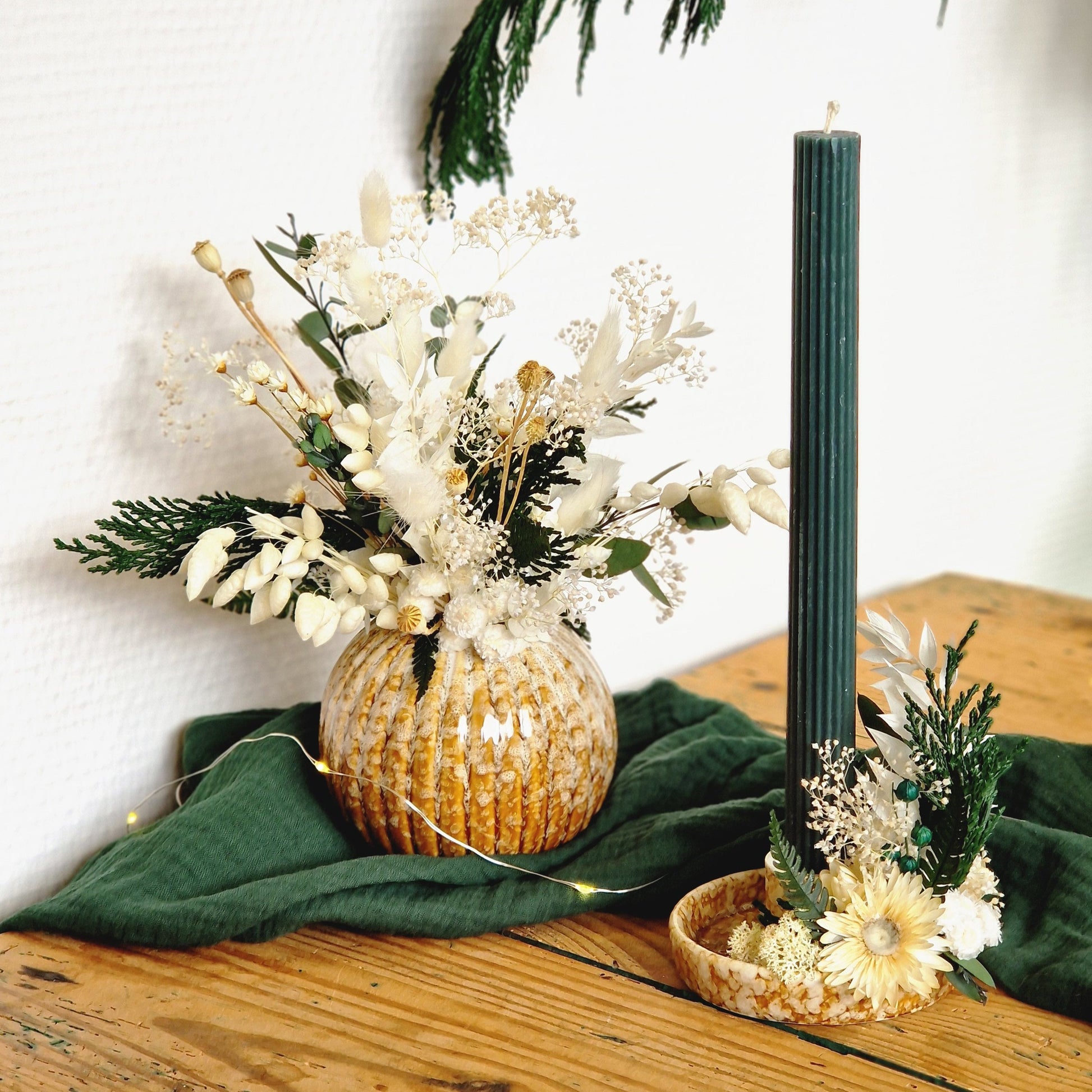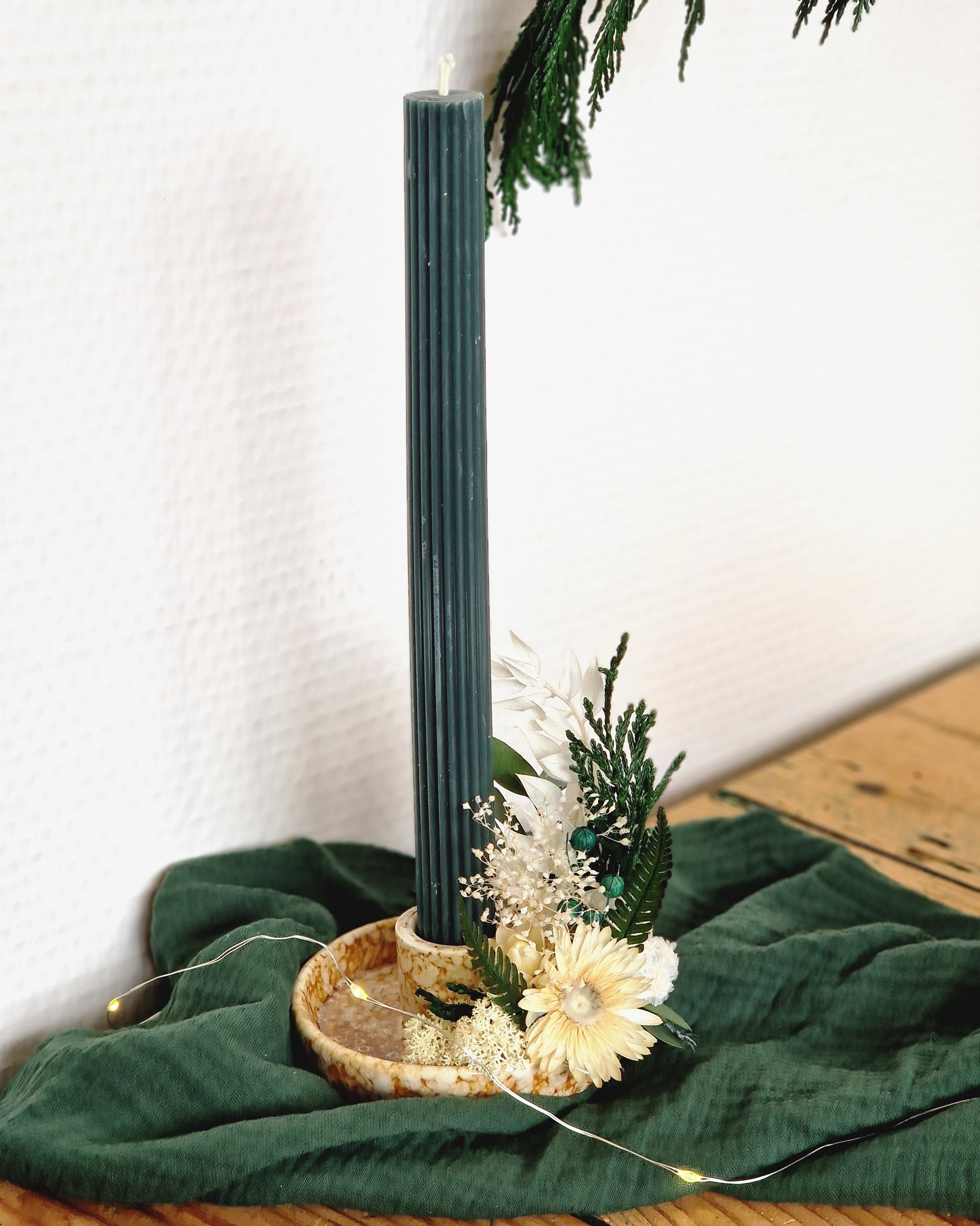 Bougeoir en céramique moucheté dans les tons moutarde , agrémenté de fleurs séchées