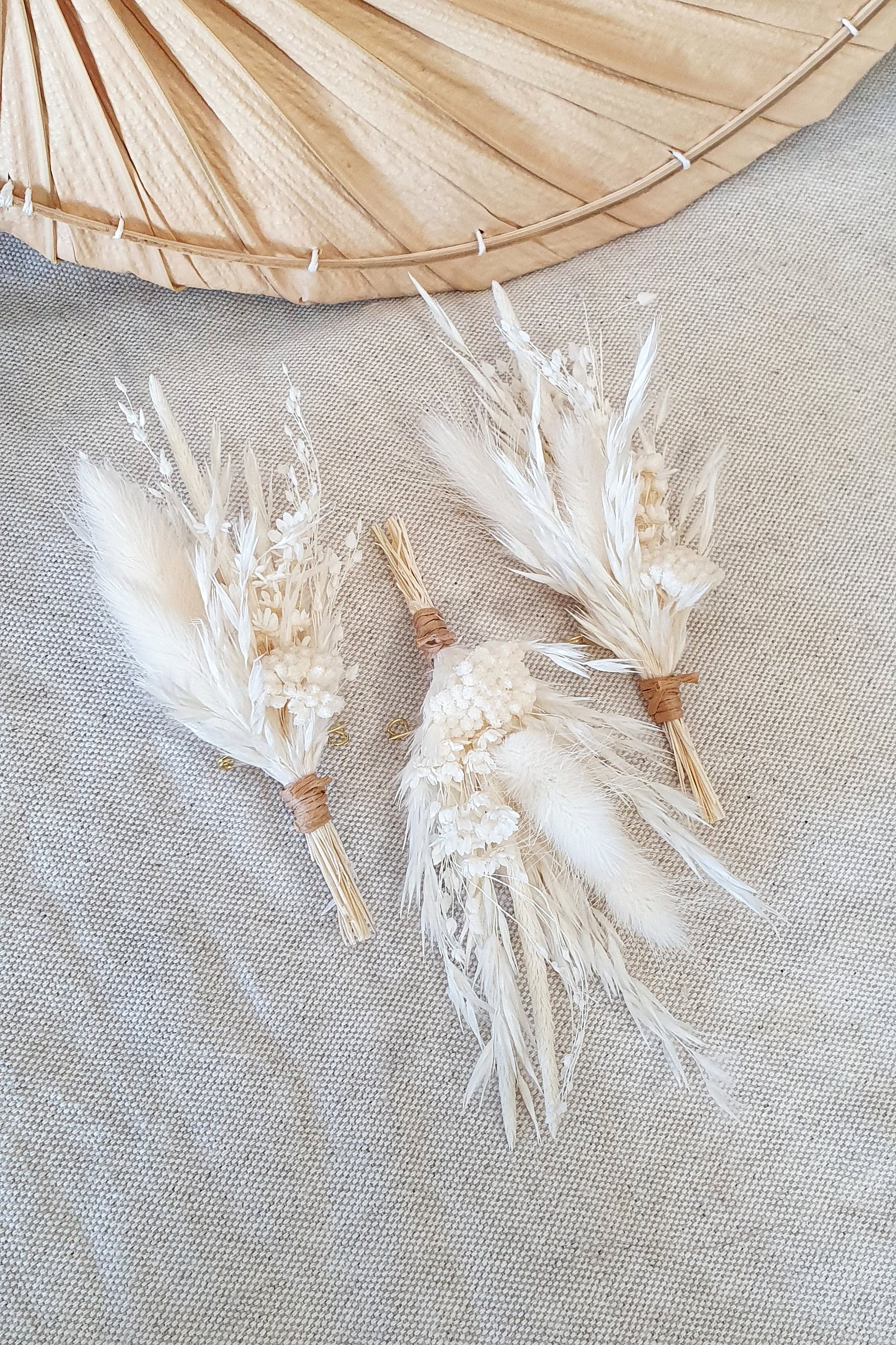 Boutonnière en fleurs séchées et stabilisées blanches.Elle donnera une touche raffinée au costume du futur marié , témoins ou papas