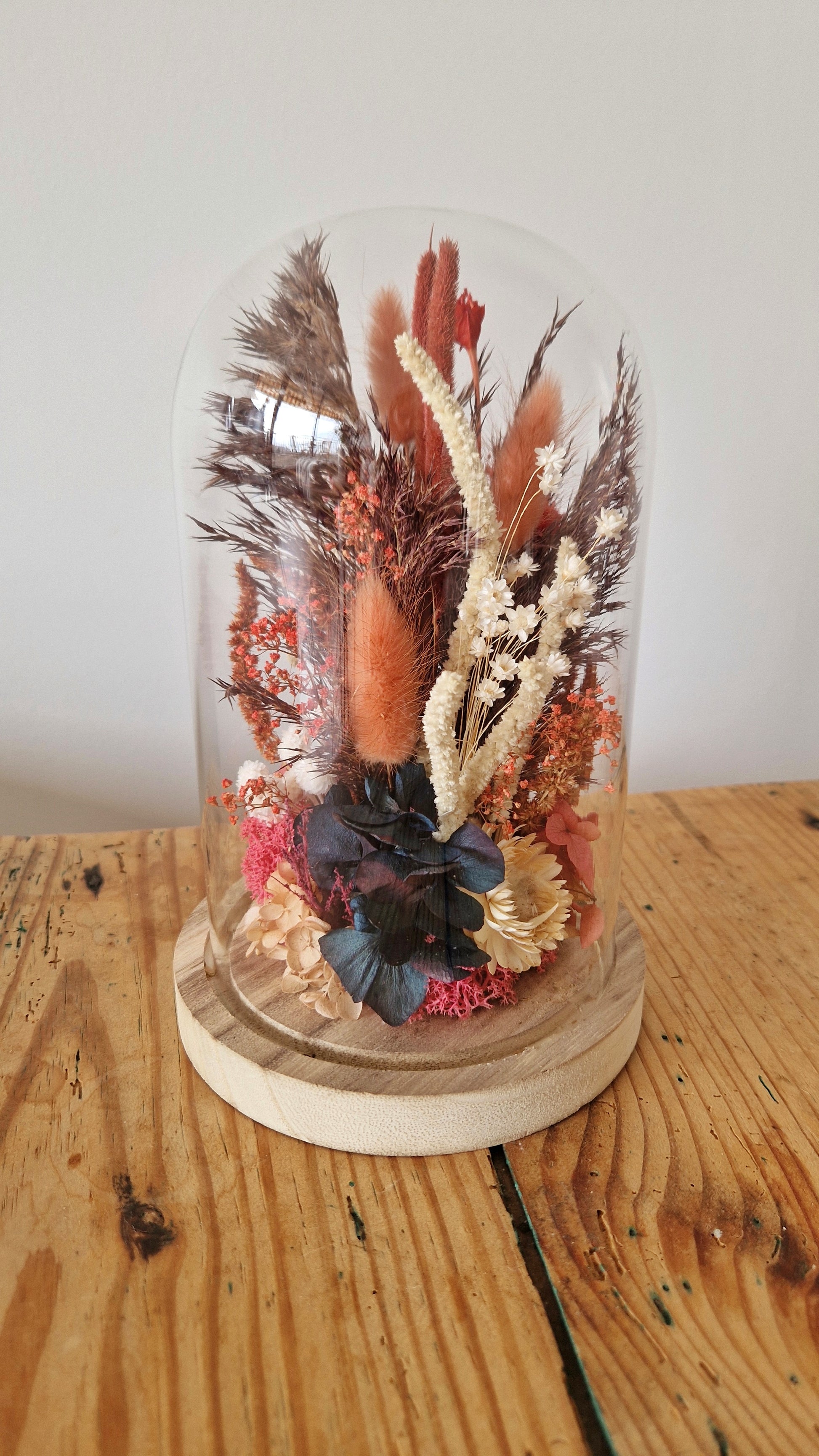 Cette cloche est idéale pour décorer une table, une étagère ou un bureau, ou pour offrir un cadeau original qui allie beauté et authenticité. Les fleurs séchées présentent l'avantage de conserver leur charme durablement, sans entretien nécessaire.
