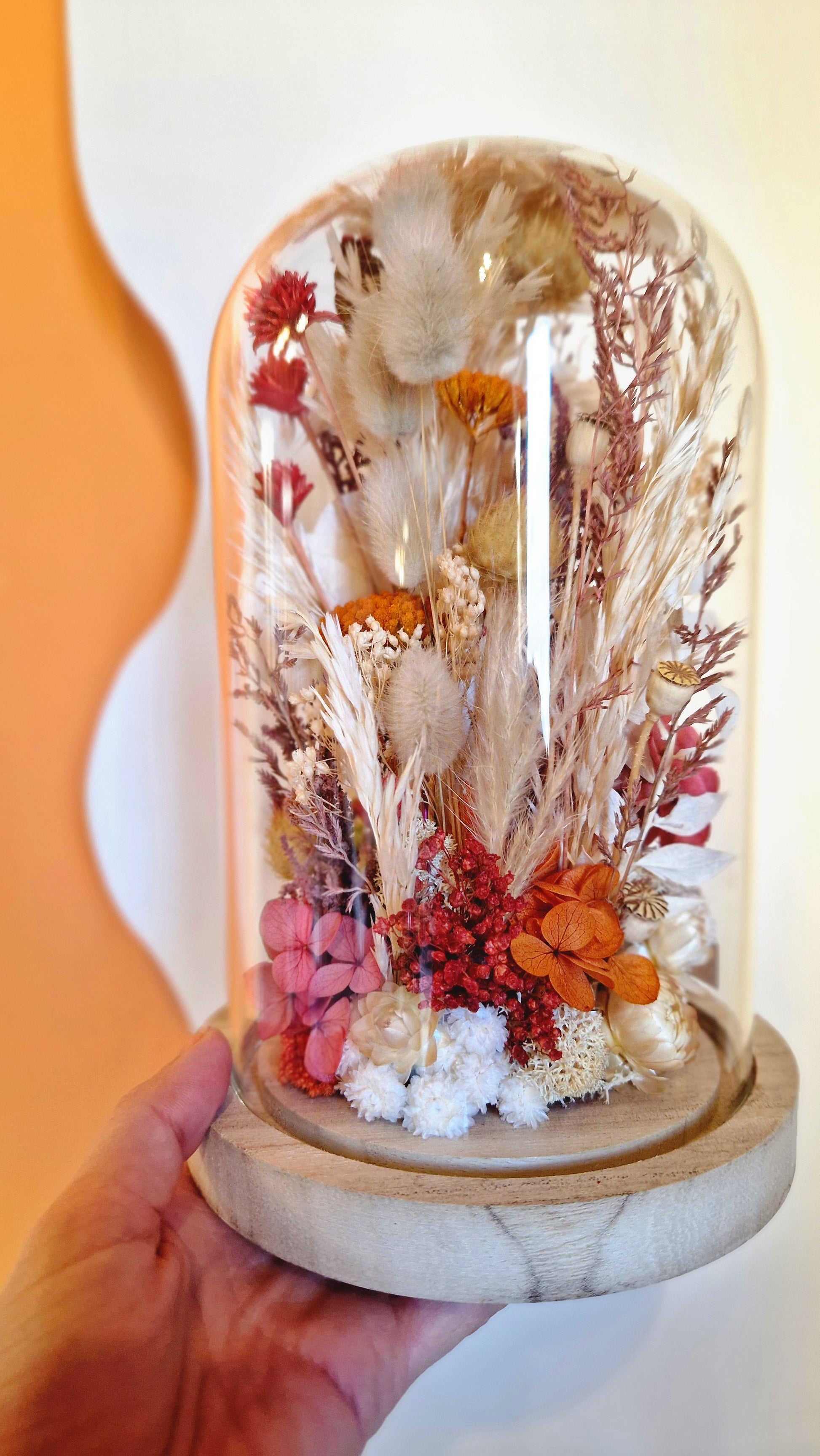 Cette cloche est idéale pour décorer une table, une étagère ou un bureau, ou pour offrir un cadeau original qui allie beauté et authenticité. Les fleurs séchées présentent l'avantage de conserver leur charme durablement, sans entretien nécessaire.