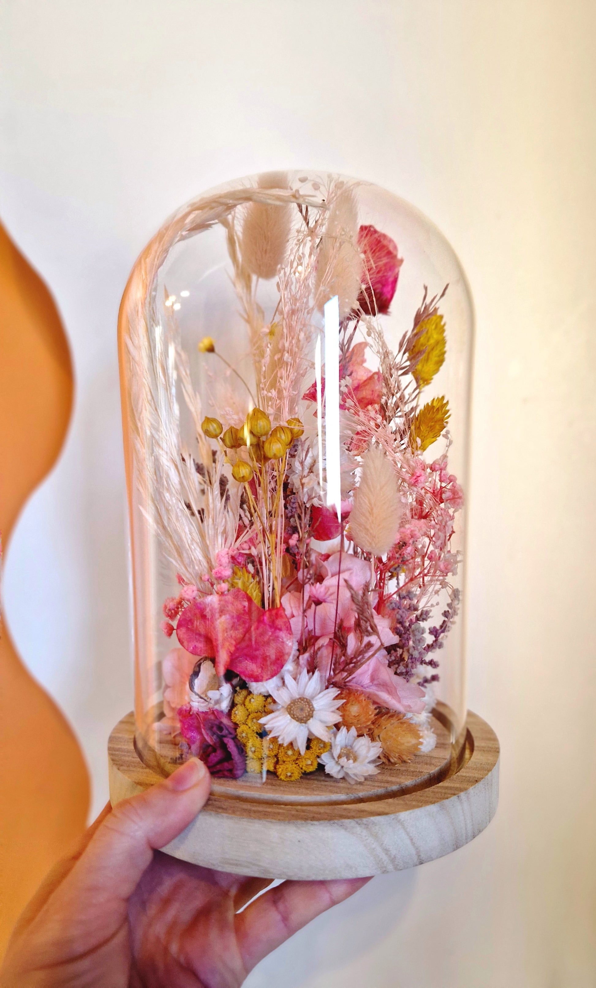 Cette cloche est idéale pour décorer une table, une étagère ou un bureau, ou pour offrir un cadeau original qui allie beauté et authenticité. Les fleurs séchées présentent l'avantage de conserver leur charme durablement, sans entretien nécessaire.