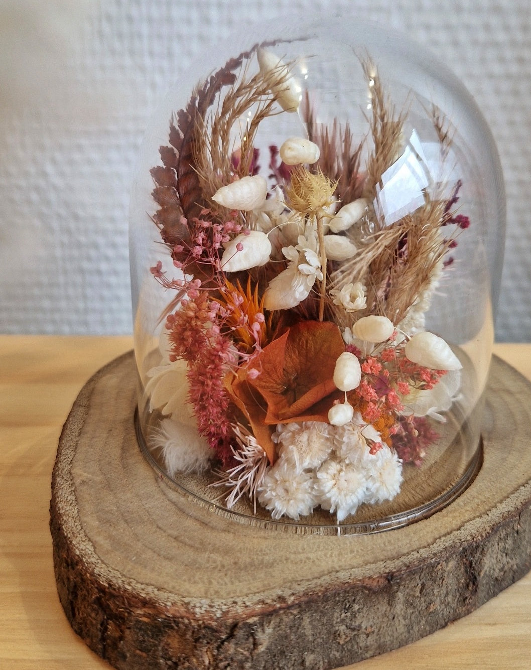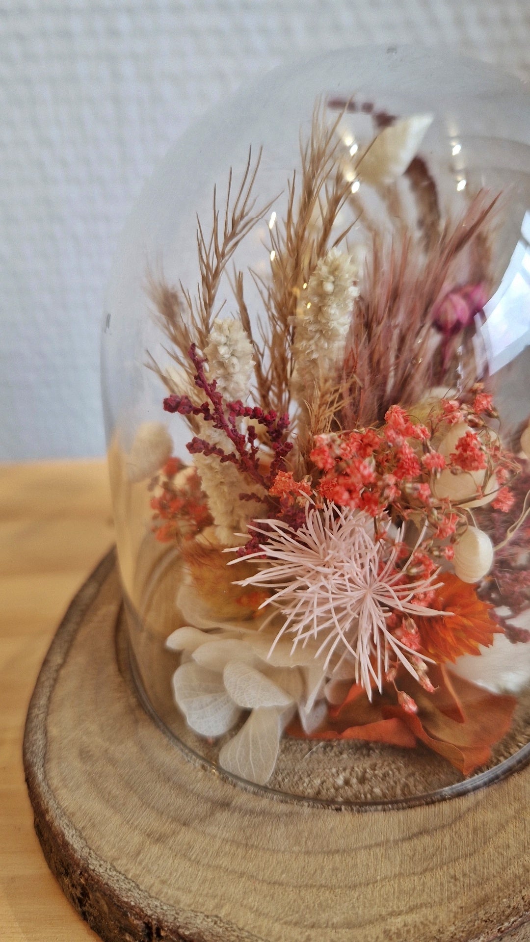 Cloche fleurie en verre sur son socle rondin de bois, agrémenté de fleurs séchées et stabilisées dans les tons colorés : orange, prune, blanc, beige & rose pale