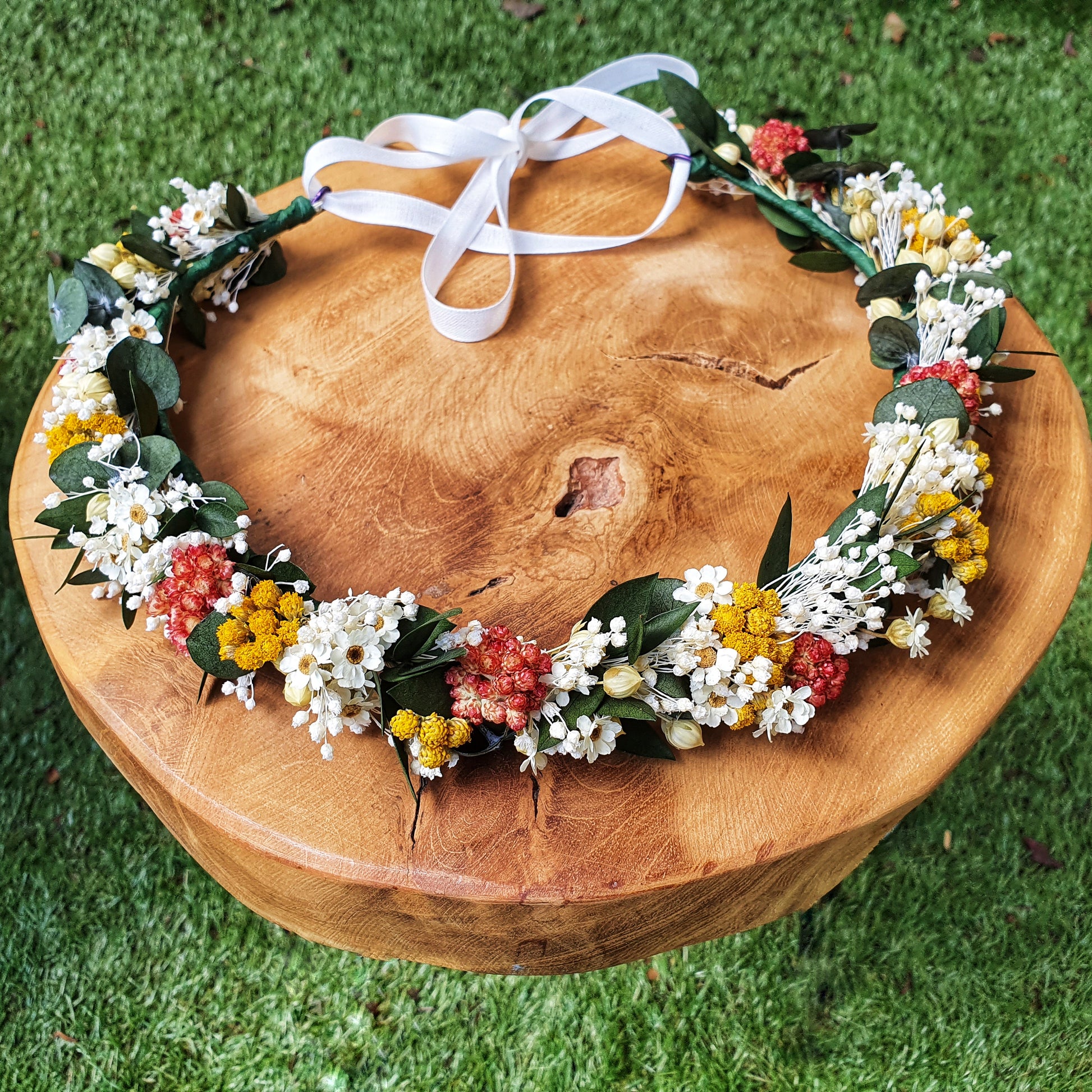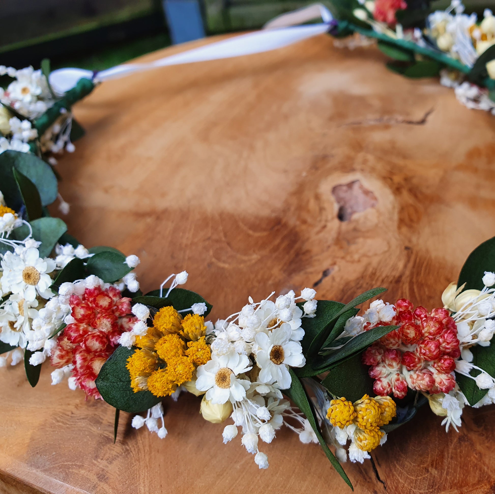 Les couronnes sont confectionnées sur commande, composées de feuillages stabilisées et fleurs séchées , elles conserveront leur forme sans faner.