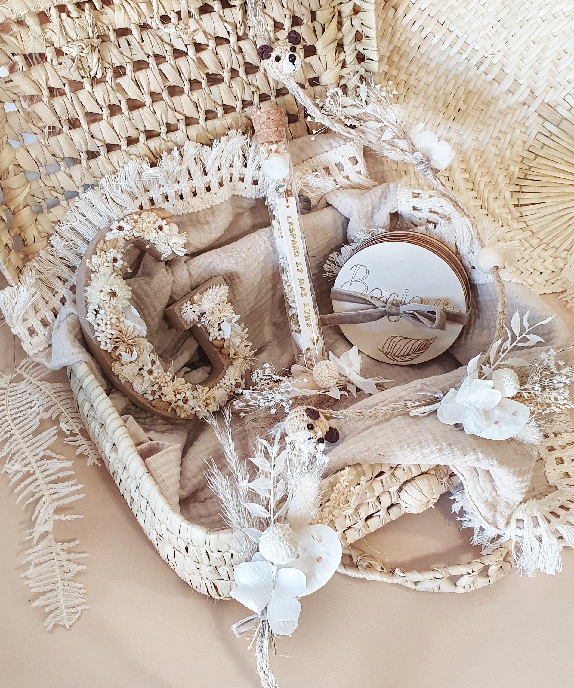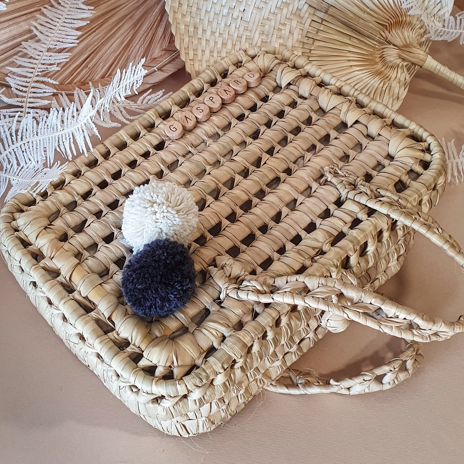 La box se présente dans une valisette en feuilles de palmier, tressée à la main par des petits artisans. Chaque valisette a le prénom du bébé inscrit dessus.