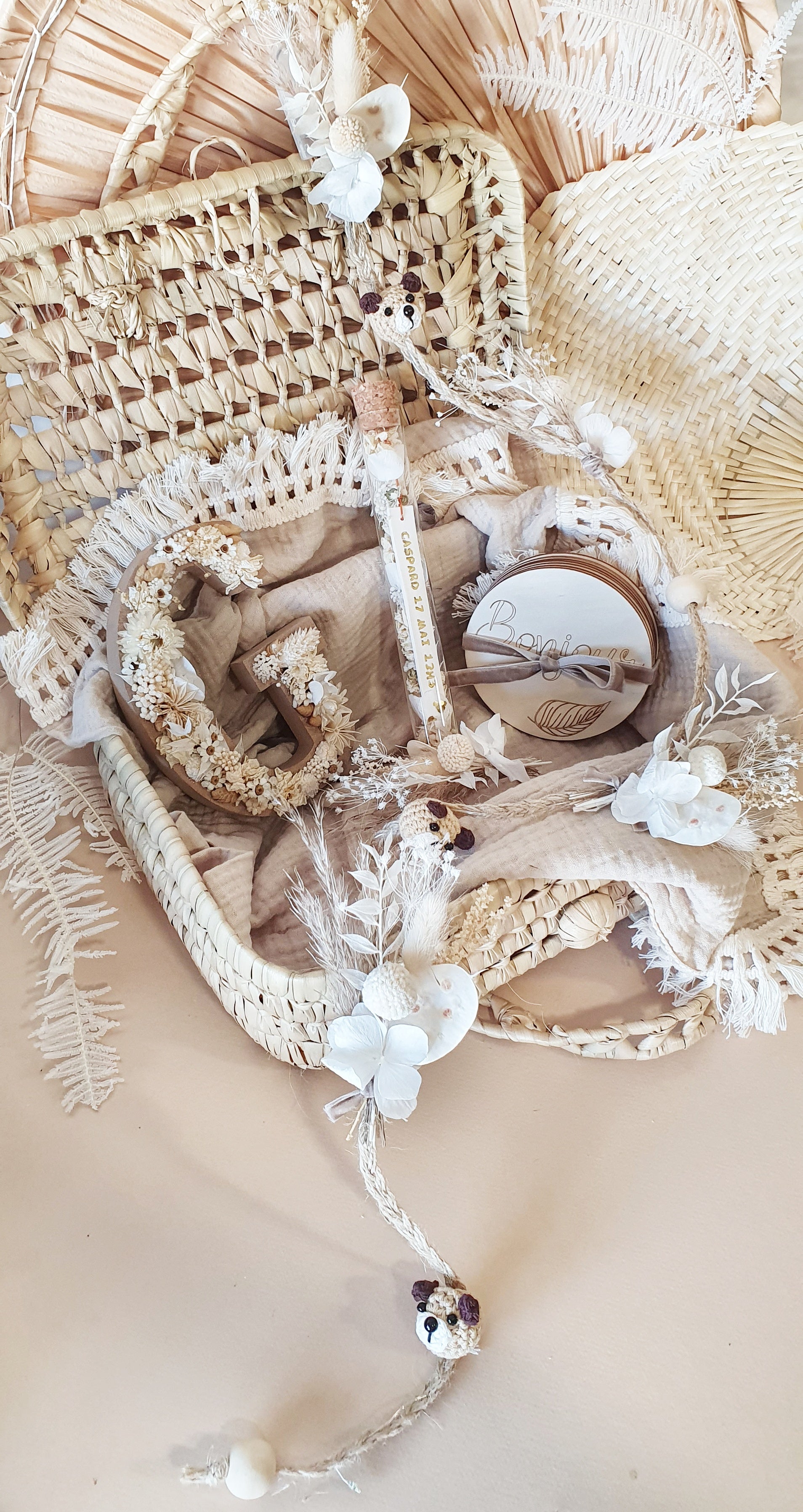 Ce coffret comprend 6 produits : une valisette ,un lange, une lettre fleurie, une guirlande lumineuse, une fiole et un kits de cartes étapes .
