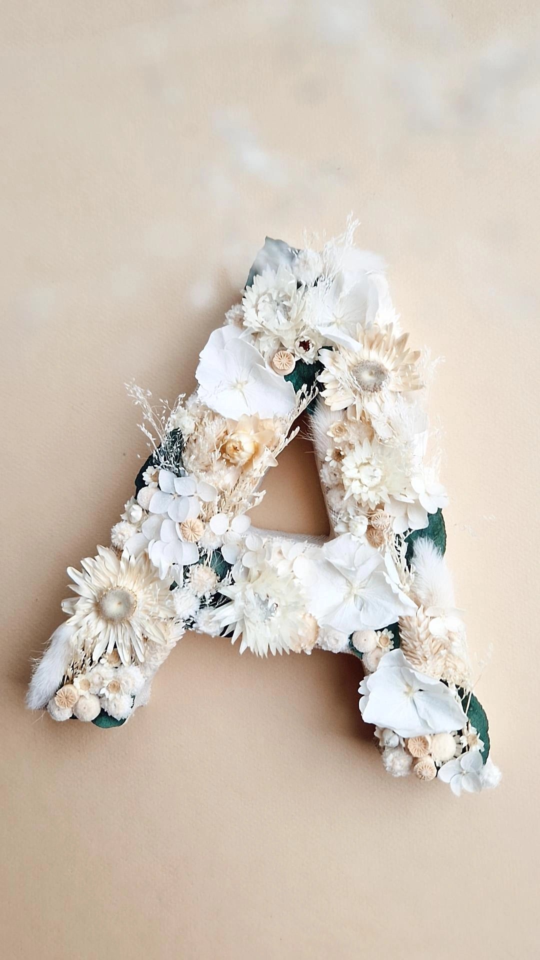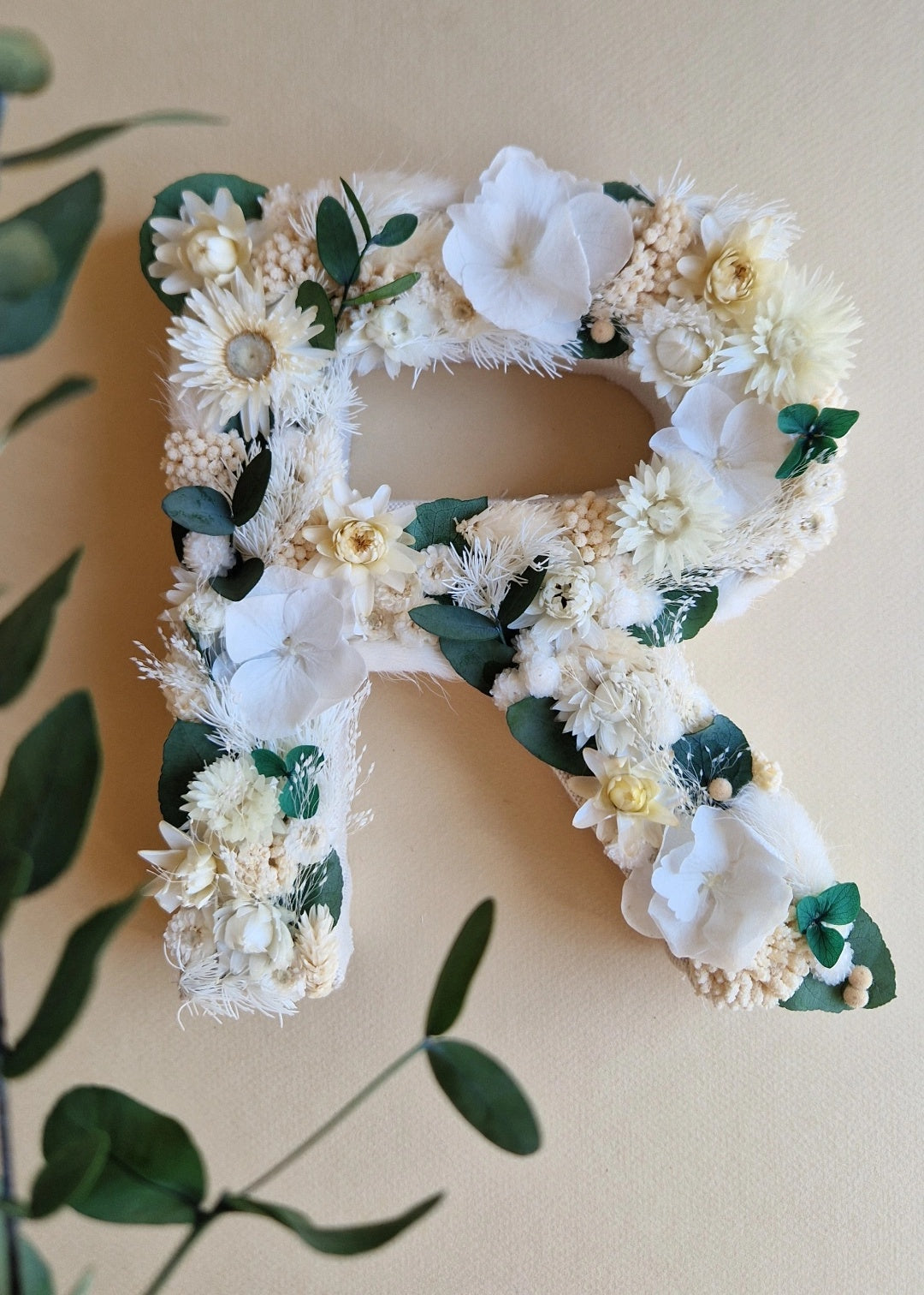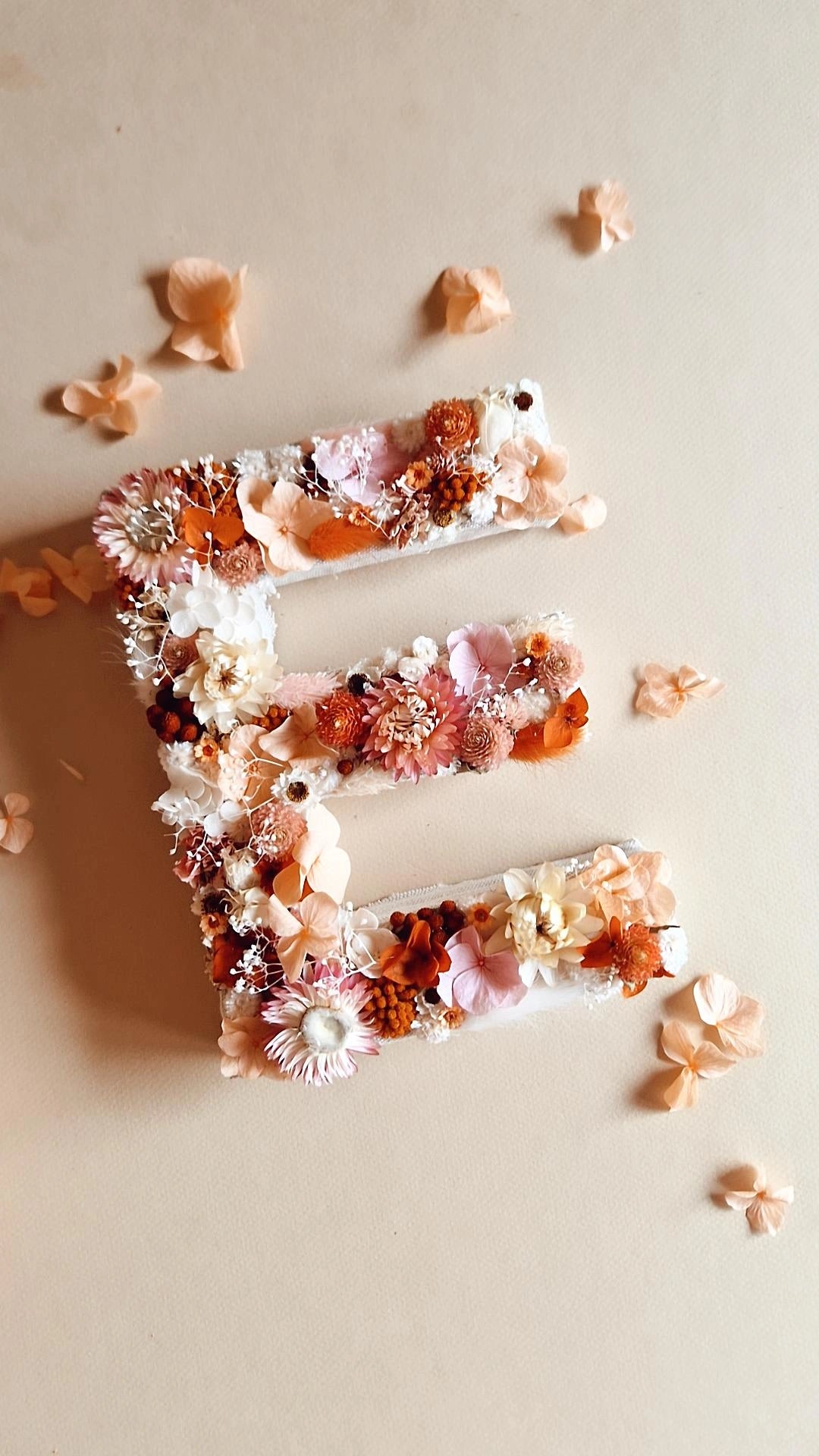 Lettre composée de fleurs séchées et stabilisées dans les couleurs de votre choix