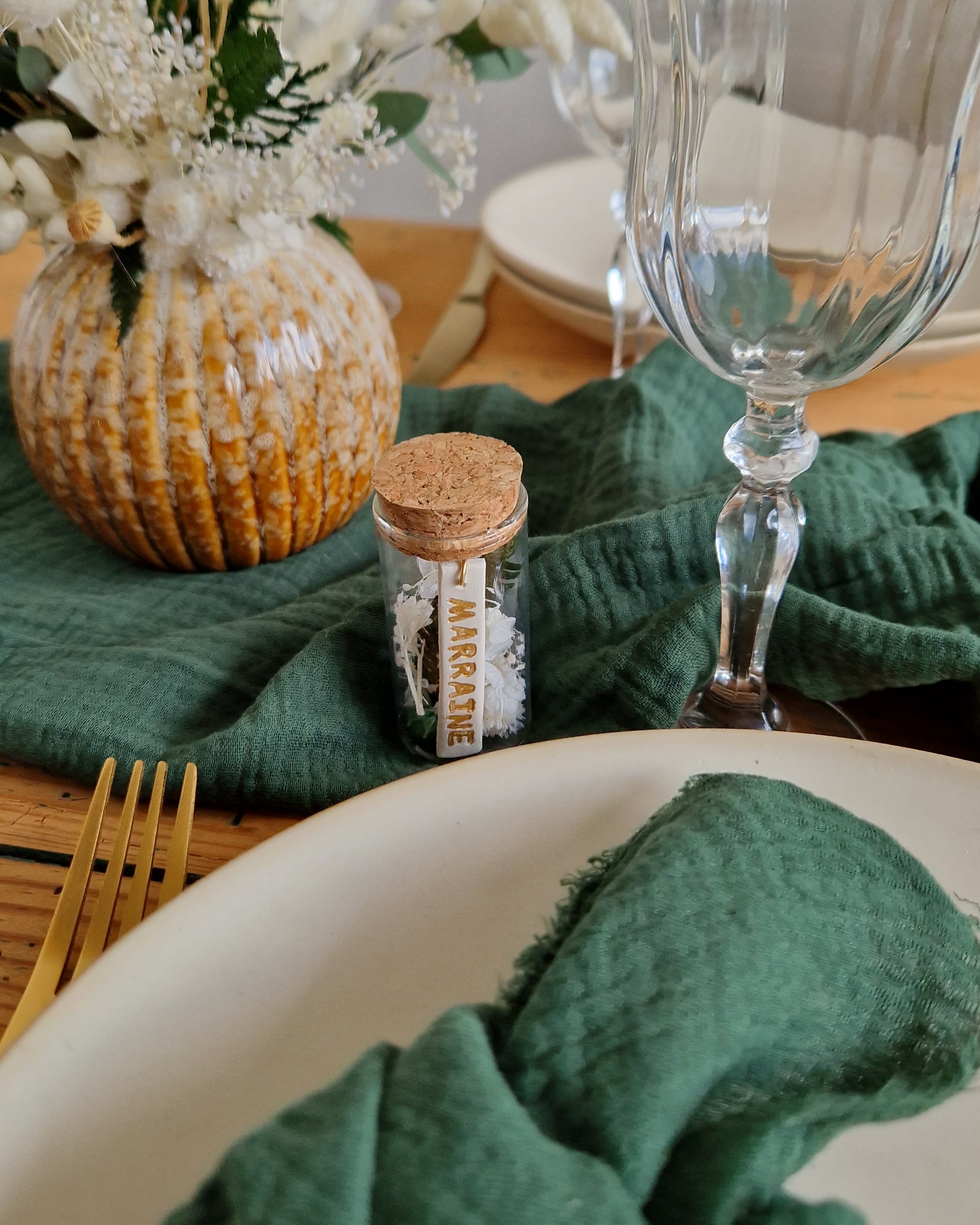 Petite fiole en verre en guise de marque place . Totalement personnalisable dans les couleurs des fleurs séchées mais également avec sa petite inscription.